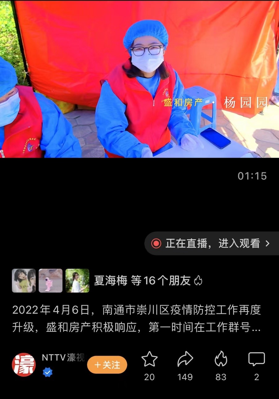 “我們公司72個人,都在社區幫忙做志愿者,也沒有什么特別想說的,就是希望南通疫情快點過去,大家能夠重返以前美好的生活。”這是公司綜合管理部員工楊園園在紅星社區核酸檢測點做志愿服務時接受NTTV采訪所說的話。——沒有報酬,沒有獎勵,沒有“研究”和“商量”,他們自覺自愿。他們是黨員,是群眾;是領導,是員工;是兒女,是父母;他們是盛和房產志愿者。